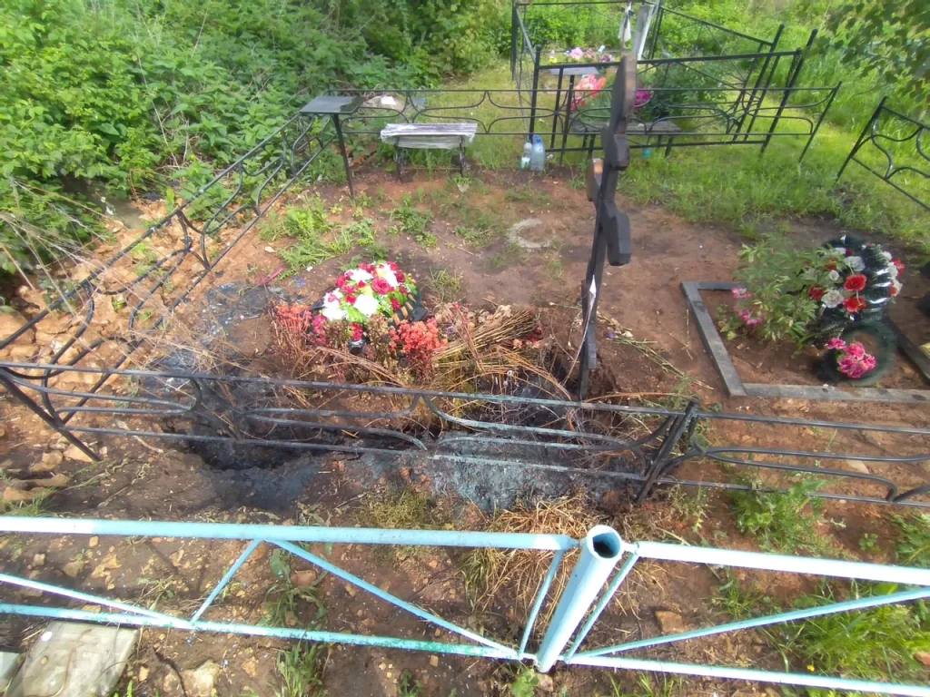 Автор поста рассказал, что приезжал на кладбище к близкому и увидел нечто - свежая могила как будто провалилась, венки и трава в пепле. Очевидец утверждает, что это был поджог.
