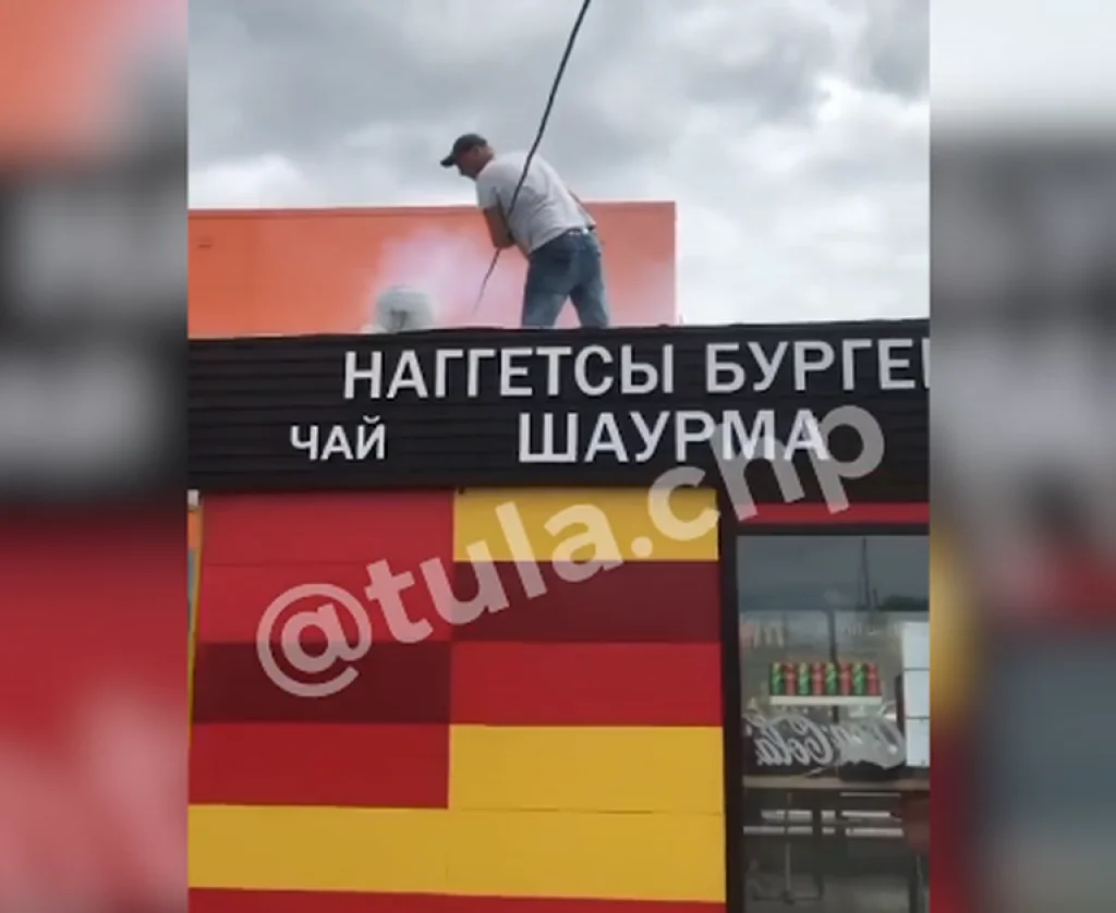 Туляки выложили видео на котором на крыше бургерной стоит мужчина и пытается потушить ее.
