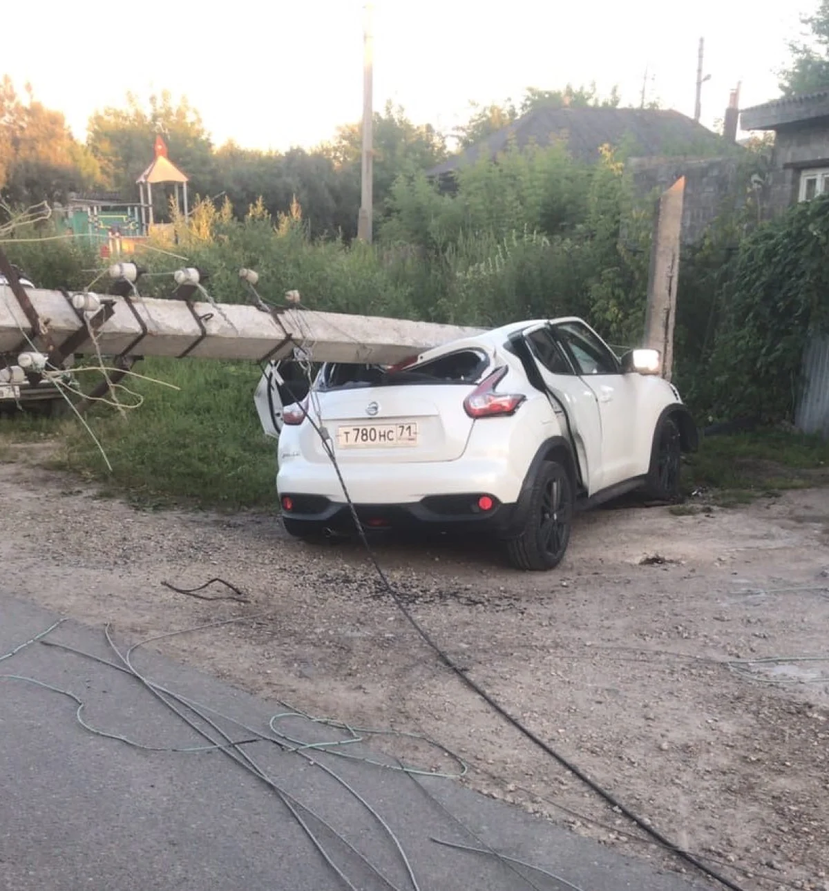 На улице Горсовета пьяная женщина за рулем Nissan Juke не справилась с управлением и врезалась в опору ЛЭП. Бетонный столб упал прямо на крышу автомобиля.