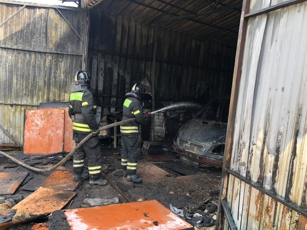Выяснилось, что горит большой железный сарай, в котором находятся автомобили. Огонь был потушен за 9 минут. Имеется пострадавший.
