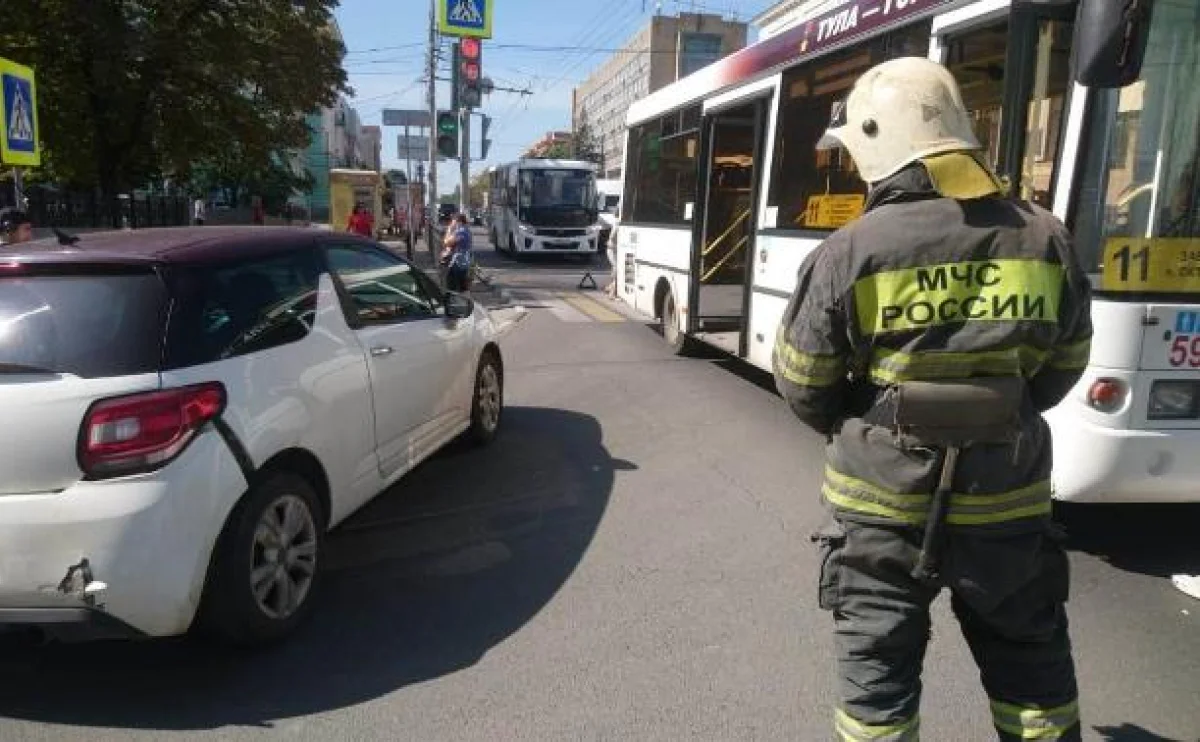 Сегодня, 4 августа, в центре Тулы на проспекте Ленина столкнулись автобус и легковой автомобиль. Об этом сообщили очевидцы в соцсетях.