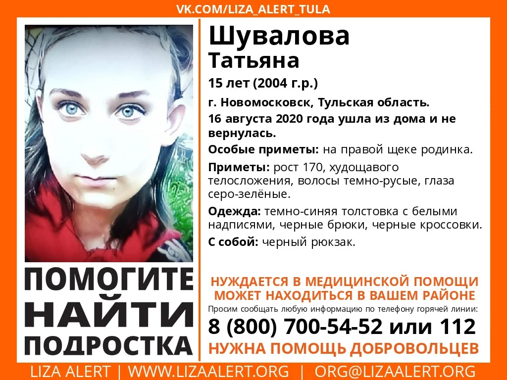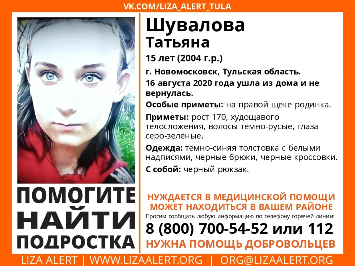 В Новомосковске Тульской области пропала 15-летняя девочка. 16 августа 2020 она ушла из дома и не вернулась.
