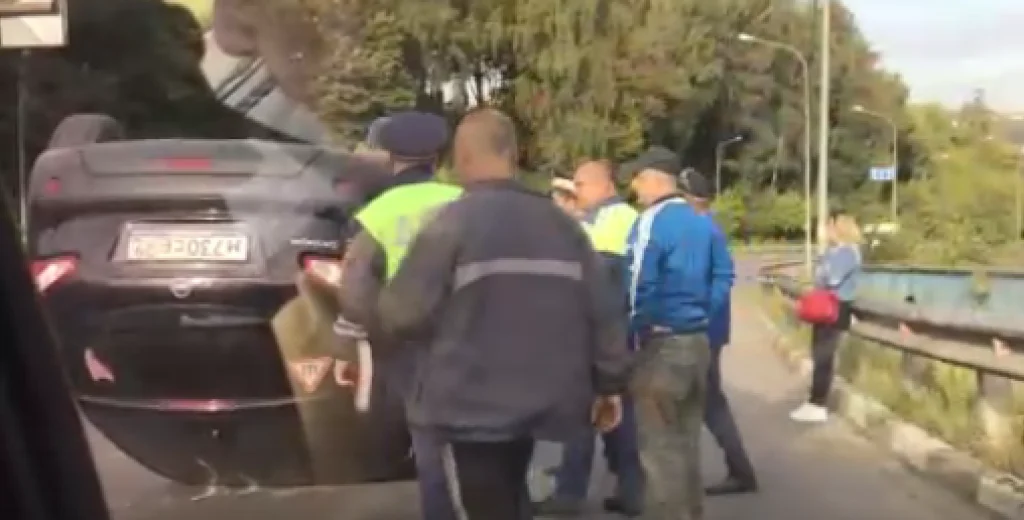 Опрокинувшаяся машина перекрыла дорогу через мост. Пробка от аварии развернулась на несколько микрорайонов города.