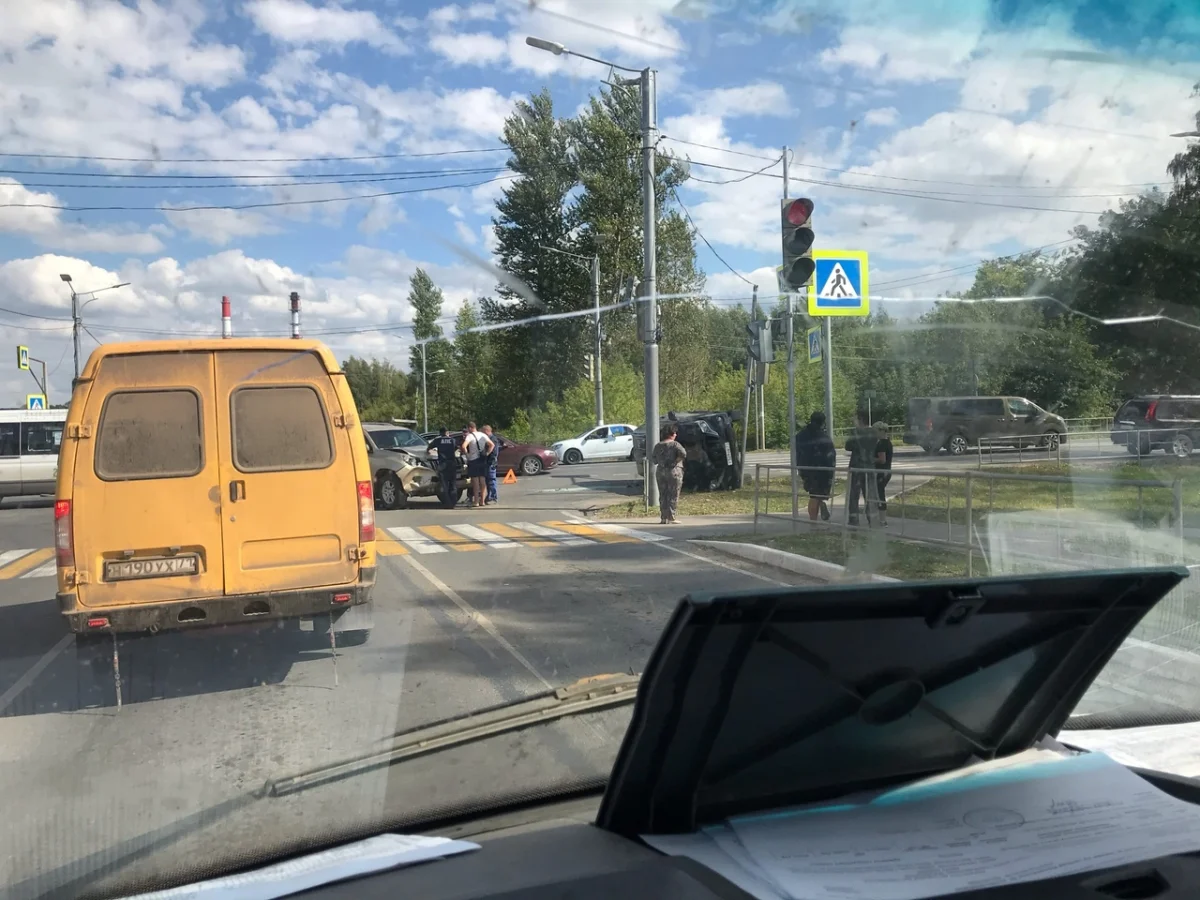 Авария произошла на перекрестке рядом с нерегулируемым пешеходным переходом. От удара одна из машин перевернулась на бок, у другой сильно деформирована передняя часть.