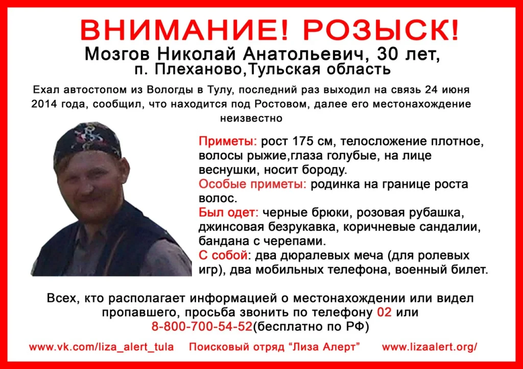 Члены поисковой группы «LizaAlert» разыскивают 30-летнего Николая Мозгова, проживавшего в поселке Плеханово. Последний раз мужчина выходил на связь 24 июня и сообщил, что находится под Ростовом. Дело в том, что пропавший направлялся автостопом в Тулу из Вологды.
