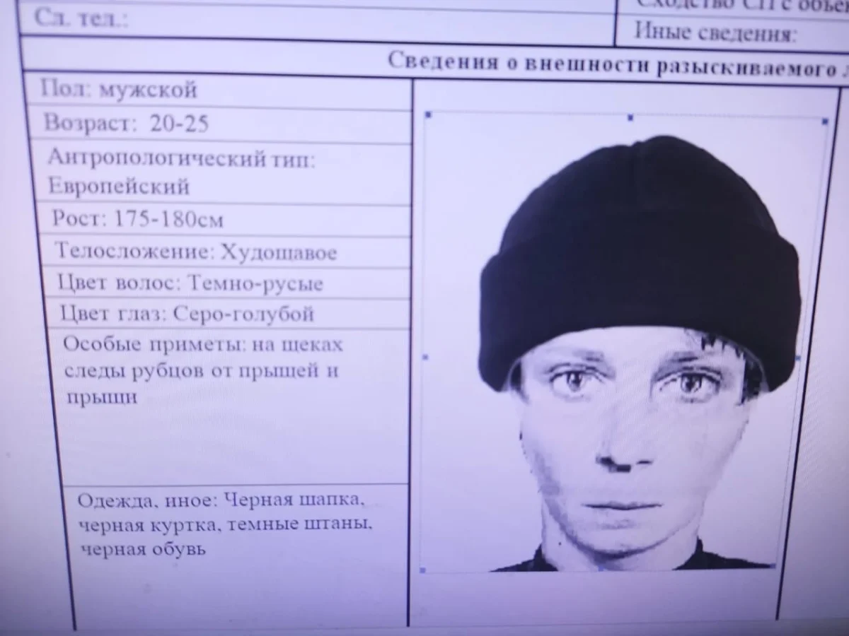 Правоохранителям удалось составить фоторобот подозреваемого. Это молодой человек лет 20-25, худощавого телосложения с рубцами на щеках.