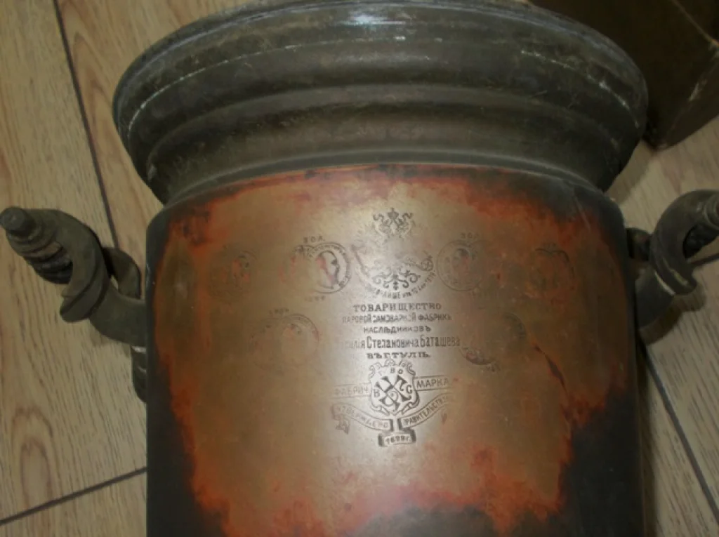 На самоваре нашли также маркировку «ТОВАРИЩЕСТВО ПАРОВОЙ САМОВАРНОЙ ФАБРИКИ НАСЛЕДНИКОВЪ ВАСИЛiЯ СТЕПАНОВИЧА БАТАШЕВА ВЪГ ТУЛIЪ, ФАБРИЧ МАРКА; УТВЕРЖДЕНО ПРАВИТЕЛЬСТВОМ 1899Г.».