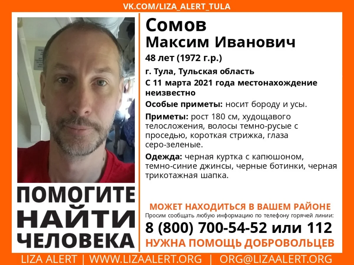 Сомов Максим Иванович, 48 лет из Тулы. Ушел из дома 11 марта и не вернулся.