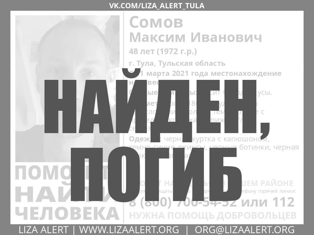 Ранее волонтеры поискового отряда «ЛизаАлерт» по Тульской области сообщали, что 11 марта 48-летний туляк Максим Сомов ушел из дома и не вернулся. О его гибели стало известно 13 марта.