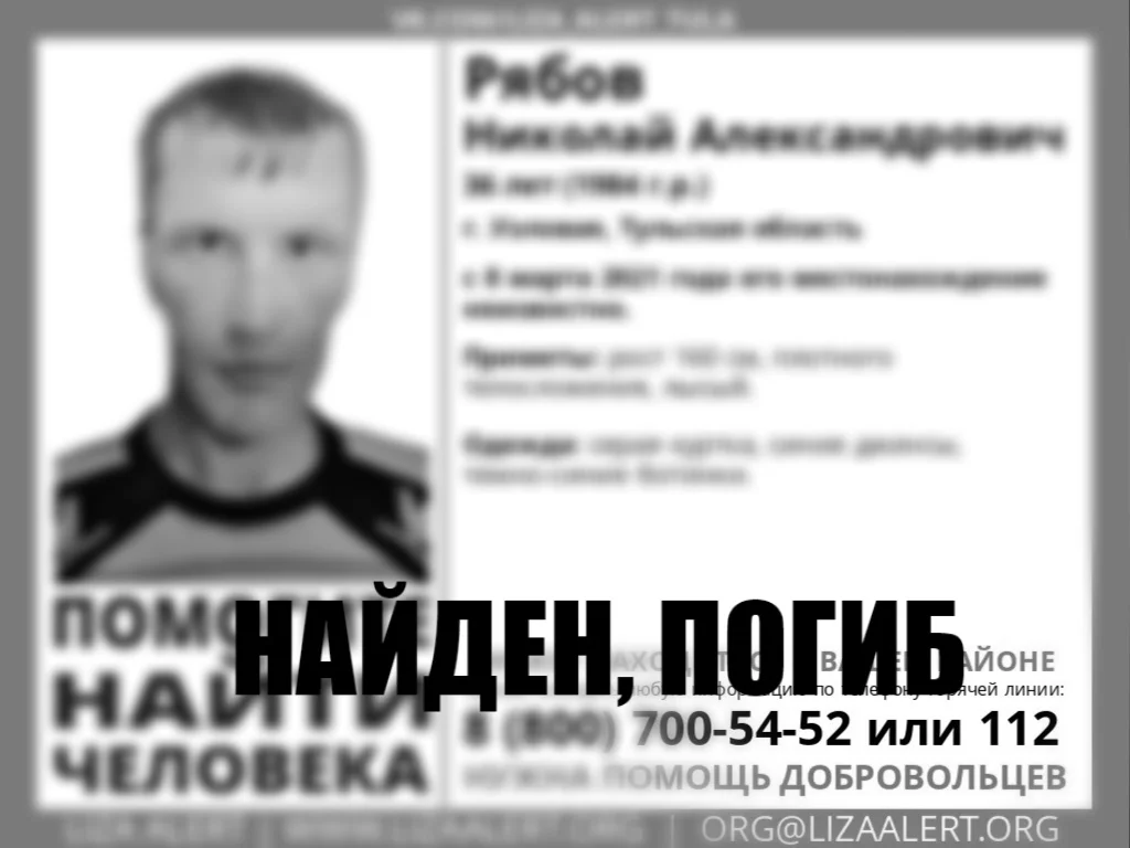 Рябов Николай Александрович 36 лет ушел из дома 8 марта и не вернулся. Отряд "Лиза Алерт" сообщает, что мужчина погиб.
