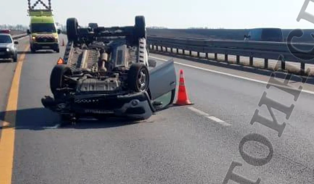 В Тульской области автоледи на иномарке на трассе сбила металлическое ограждение. Машина при этом перевернулась на крышу.