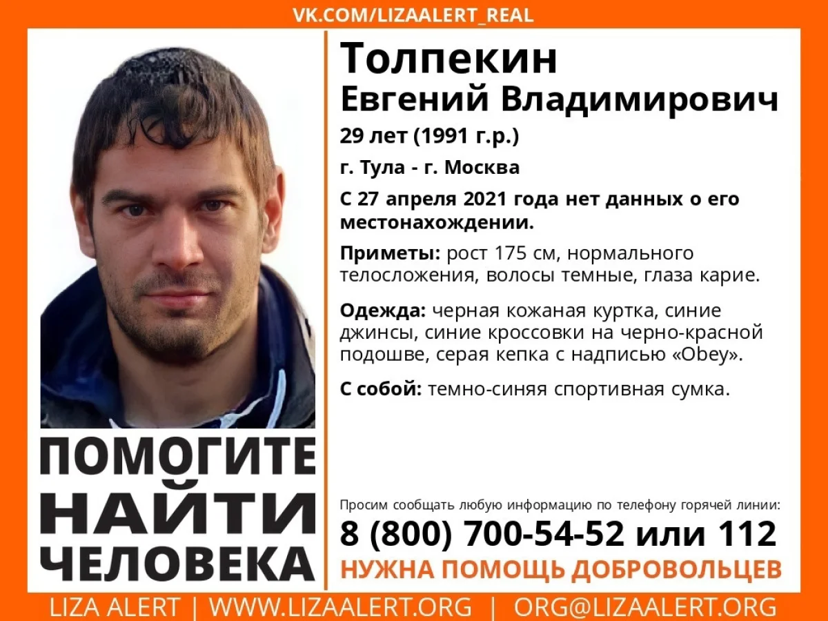 Поисковый отряд "ЛизаАлерт" просит туляков помочь в поисках пропавшего мужчины. Толпекин Евгений Владимирович, 29 лет, пропал 27 апреля 2021 года, с того времени его местонахождение неизвестно.