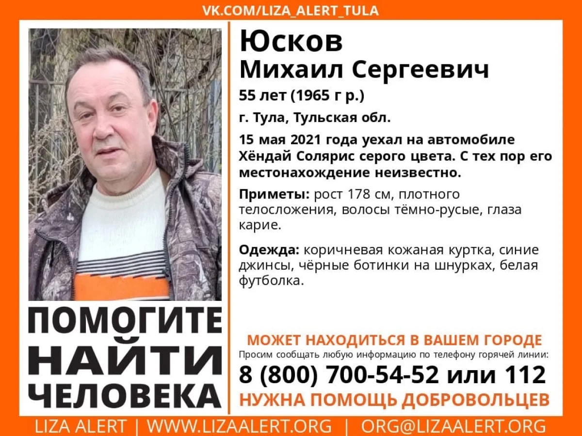 Поисковый отряд «ЛизаАлерт» по Тульской области просит жителей региона помочь с поисками пропавшего человека. 15 мая 2021 года Юсков Михаил Сергеевич, 55 лет, уехал на автомобиле «Хёндай Солярис» серого цвета. С тех пор его местонахождение неизвестно.