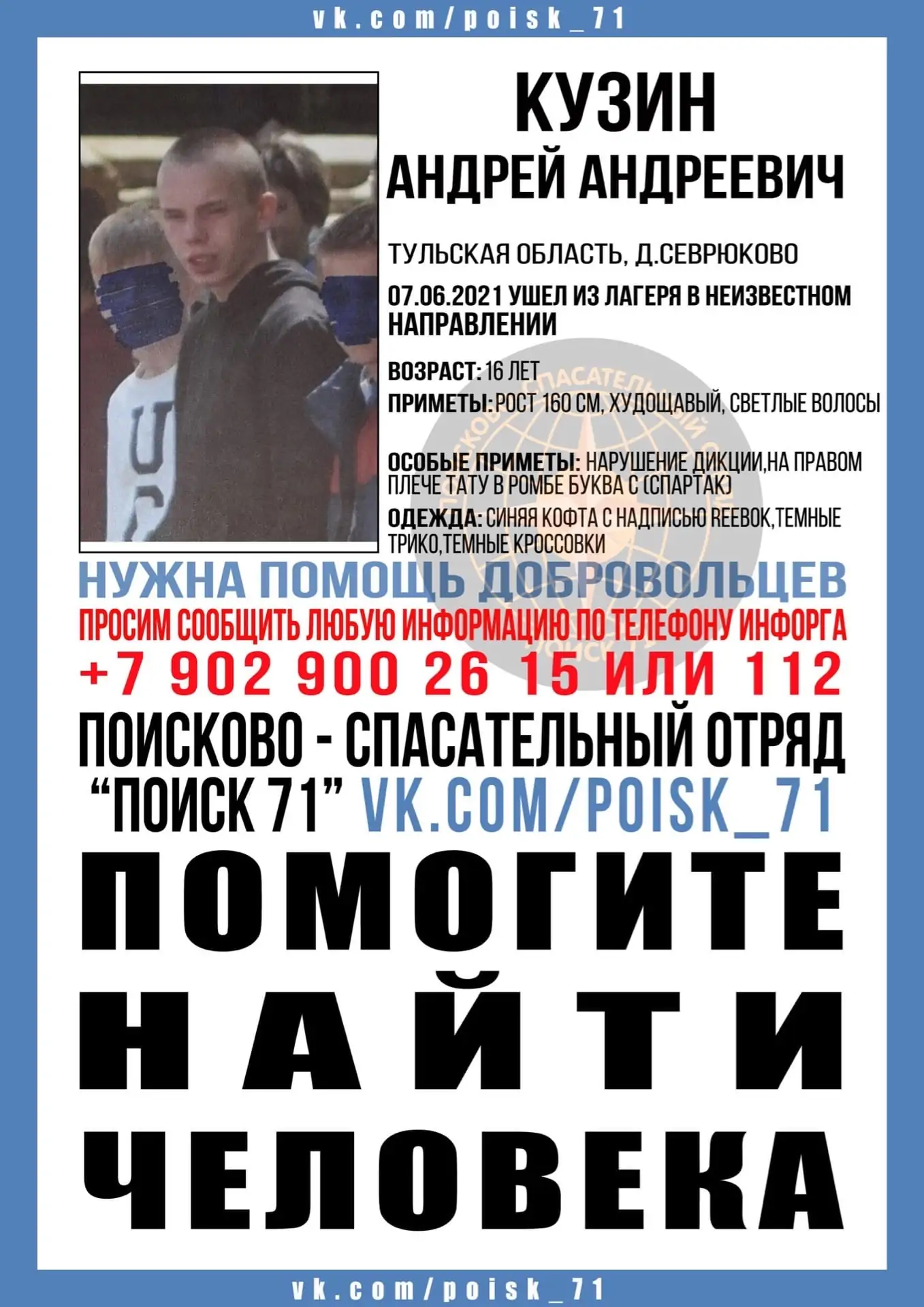 Как сообщает отряд «Поиск71», из детского лагеря «Дружба» в деревне Севрюково Тульской области пропал 16-летний мальчик, Кузин Андрей Андреевич. Вчера, 7 июня, он ушёл из лагеря в неизвестном направлении.