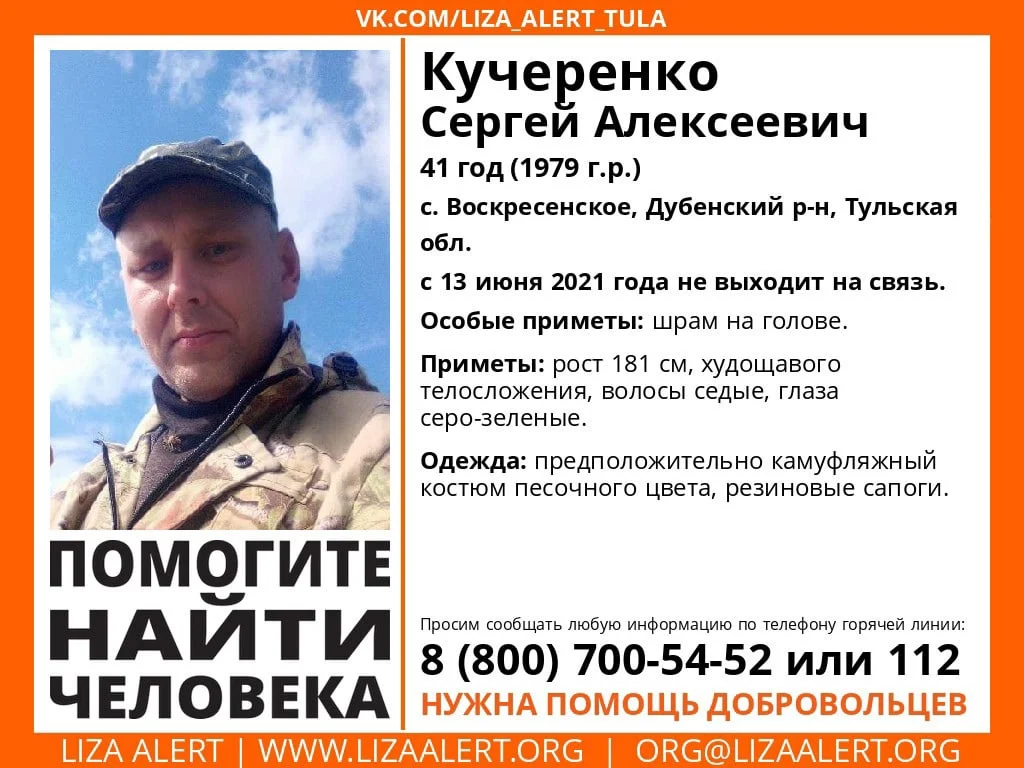 Поисково-спасательный отряд "ЛизаАлерт" просит жителей Тульской области помочь в поисках мужчины. Пропавший - 41-летний Сергей Алексеевич Кучеренко из села Воскресенское в Дубенском районе Тульской области. Утром 13 июня 2021 года его видели в последний раз, с тех пор местонахождение неизвестно.