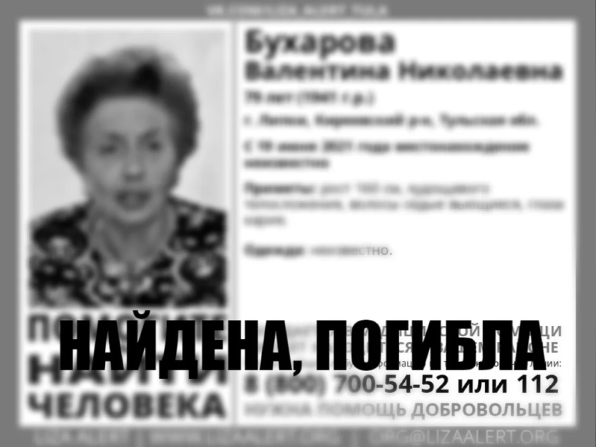 Члены поисково-спасательного отряда «ЛизаАлерт» сообщили о прекращении поисков Валентины Николаевны Бухаровой из Липок в Киреевском районе Тульской области. К сожалению , причина прекращения поисков печальна - 79-летнюю женщину нашли мертвой. Обстоятельства смерти не сообщаются. Члены отряда принесли свои соболезнования родным погибшей.
