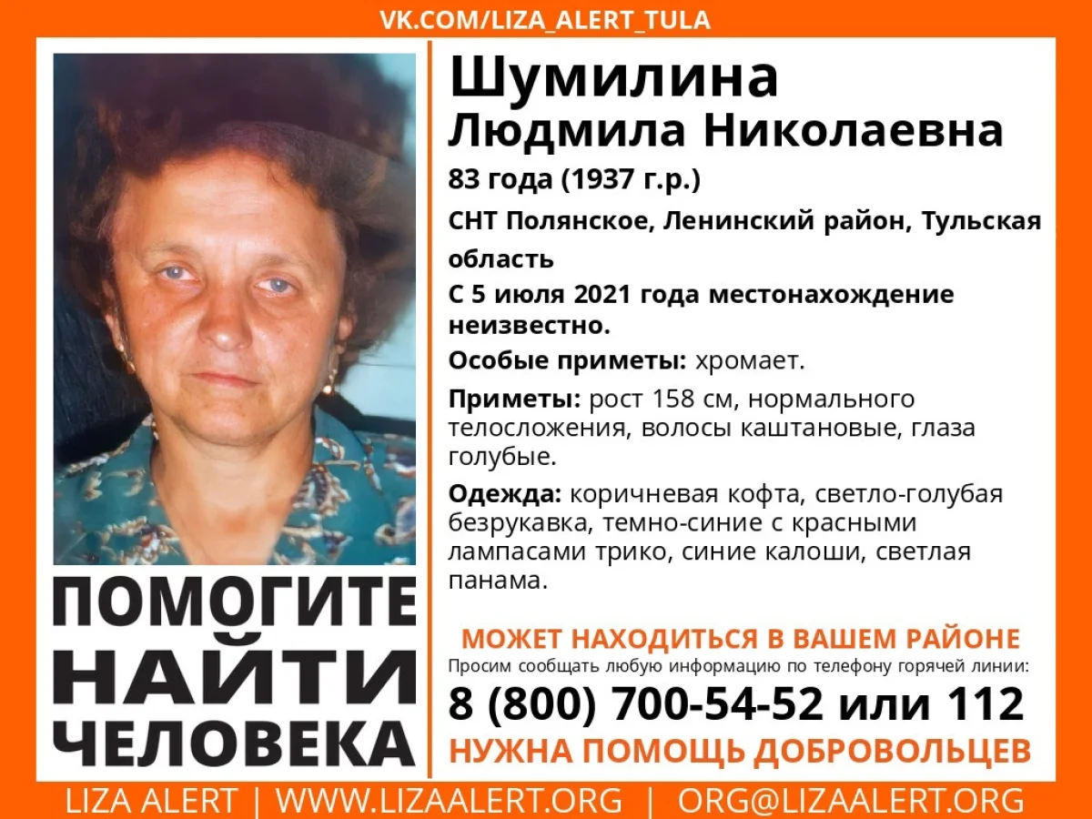 Из СНТ Полянское в Ленинском районе Тульской области ушлав неизвестном напарвлении и не вернулась 83-летняя Людмила