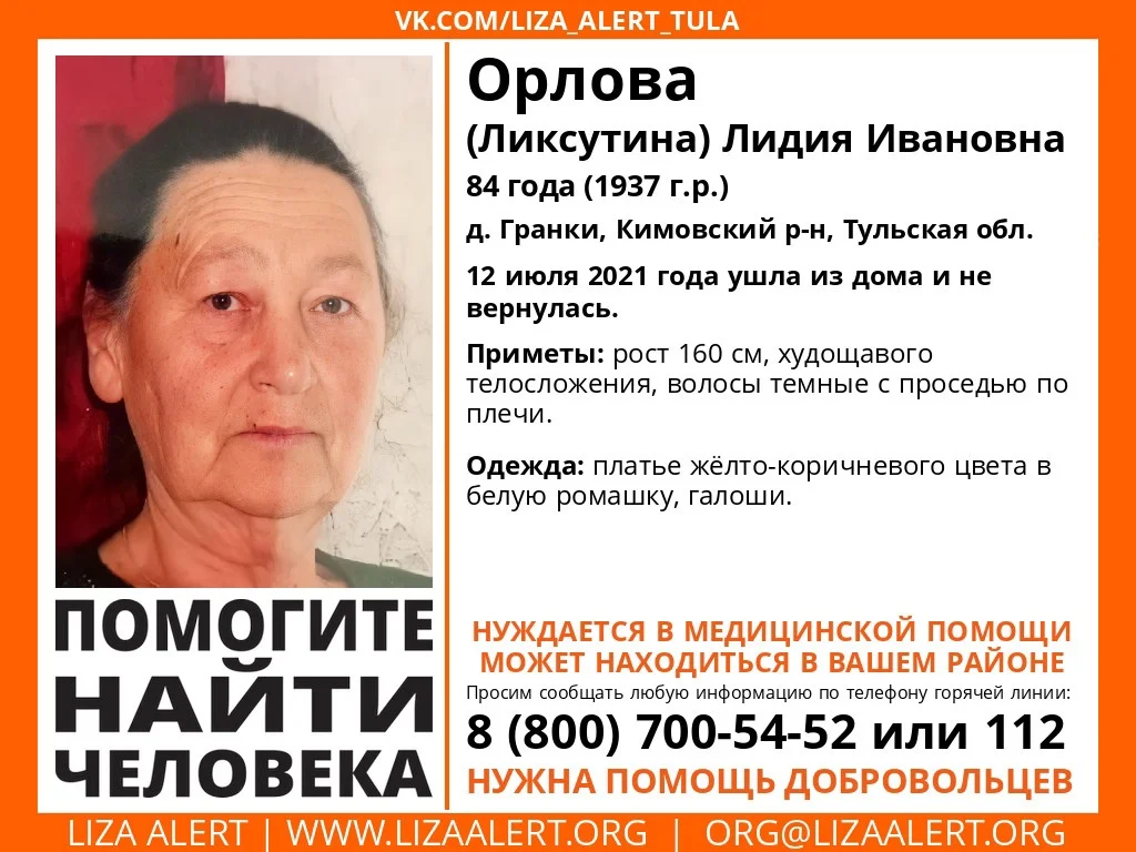 12 июля 2021 года из дома в деревне Гранки Кимовского района ушла и не вернулась 84-летняя Лидия Ивановна Орлова. Поисково-спасательный отряд "ЛизаАлерт" просит жителей Тульской области помочь в поисках.