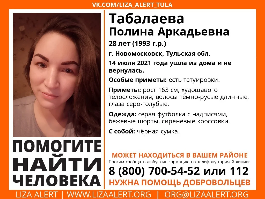 14 июля в Новомосковске ушла из дома и не вернулась 28-летняя Полина Аркадьевна Табалаева.