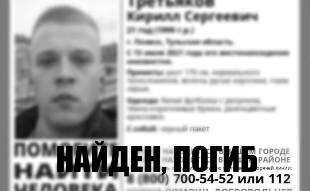 21-летний житель Плавска, Кирилл Третьяков, о местонахождении которого ничего не было известно с 13 июля, был найден мертвым. Об этом сообщили поисковики отряда «Лиза Алерт», который объявляли его в розыск несколькими днями ранее.