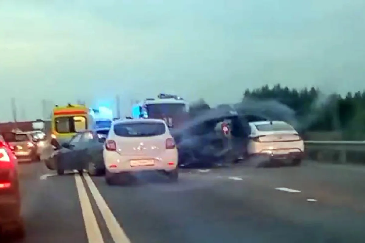 По предварительной информации, большегруз Volvo по касательной задел Toyota, и та вылетела на встречку, где собрала несколько автомобилей — такси Hyundai Sonata, Chevrolet Niva и Renault Sandero. При этом автомобиль Chevrolet Niva перевернулся.