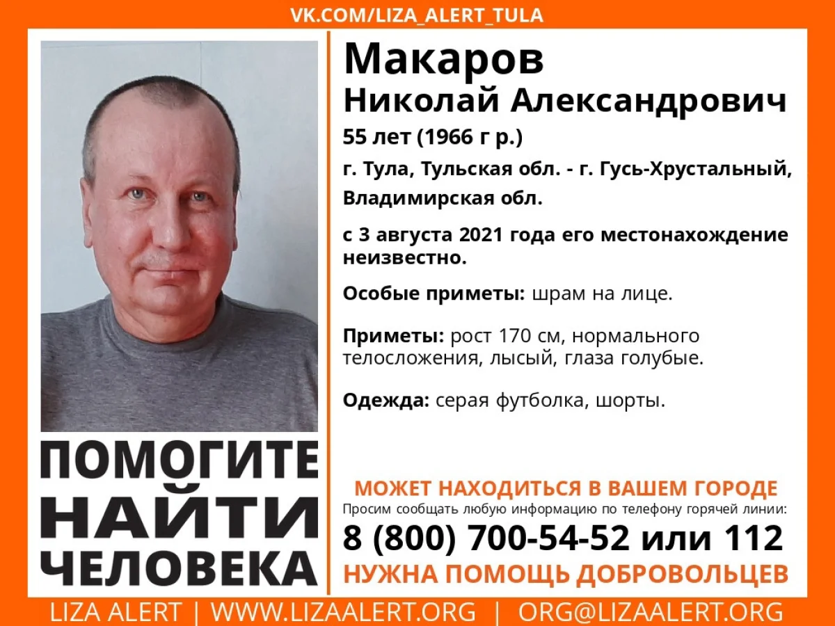 В Тульской области ищут пропавшего 55-летнего Николая Александровича Макарова из Гуся-Хрустального Владимирской