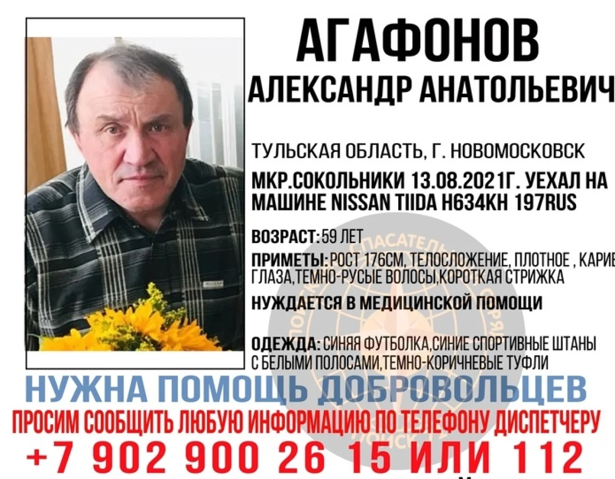 В Тульской области объявили в розыск пропавшего без вести 59-летнего Агафонова Александра Анатольевича. По имеющимся данным, 13 августа он уехал из дома в Новомосковске на автомобиле «Ниссан Тиида» серебристого цвета с государственным номером Н 634 КН 197, с тех пор о его местонахождении ничего не известно. Мужчина нуждается в медицинской помощи.