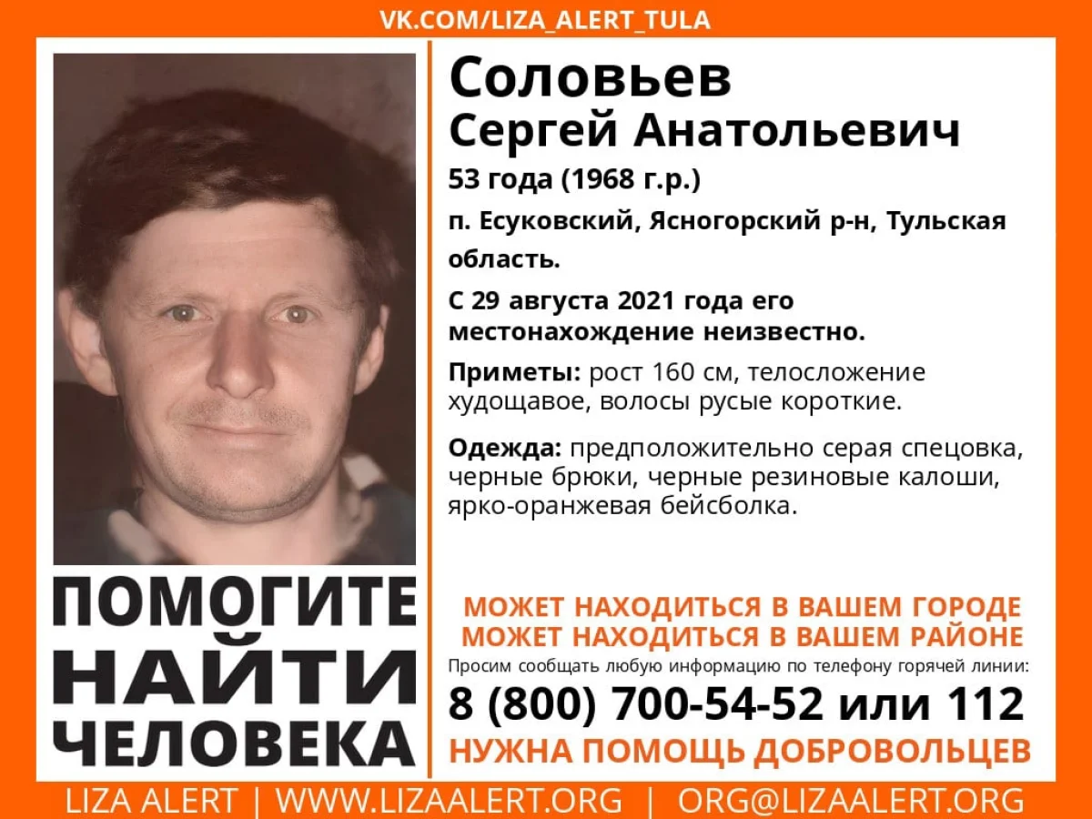 В Ясногорском районе поисковики отряда «ЛизаАлерт» ищут пропавшего 53-летнего Сергея Анатольевича Соловьева из поселка Есуковский. С 29 августа 2021 года его местонахождение неизвестно.