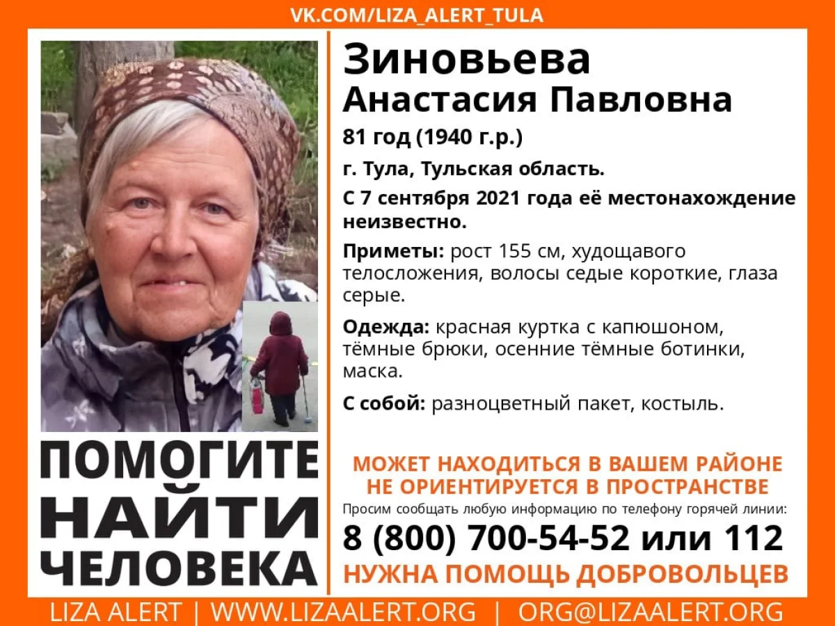Зиновьевой Анастасии Павловны из Тулы. Она пропала 7 сентября 2021 года, с тех пор ее местонахождение