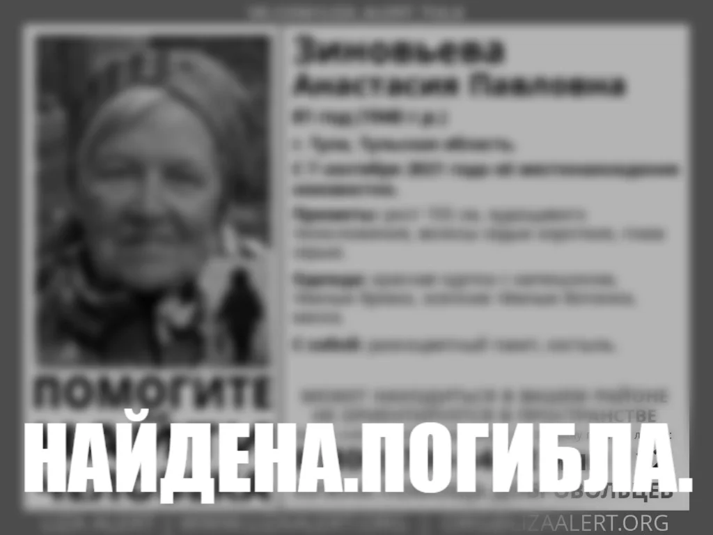 81-летняя Анастасия Зиновьева, пропавшая 7 сентября в Туле, была найдена мертвой 19 сентября в воскресенье, об этом сообщили волонтеры поискового отряда «Лиза Алерт». Тело пожилой женщины нашли примерно в двадцати метрах от реки Упы в районе села Осиновая Гора.