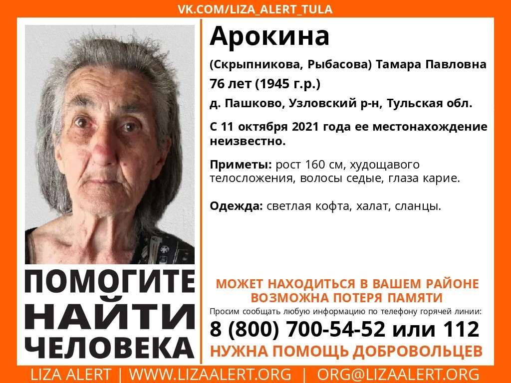 В Тульской области волонтеры поисково-спасательного отряда "ЛизаАлерт" начали поиски пропавшей 76-летней Тамары Павловны Арокиной (Скрыпниковой, Рыбасовой) из деревни Пашково, Узловского района. С 11 октября 2021 года ее местонахождение неизвестно.
