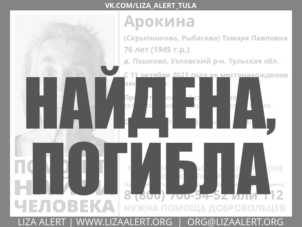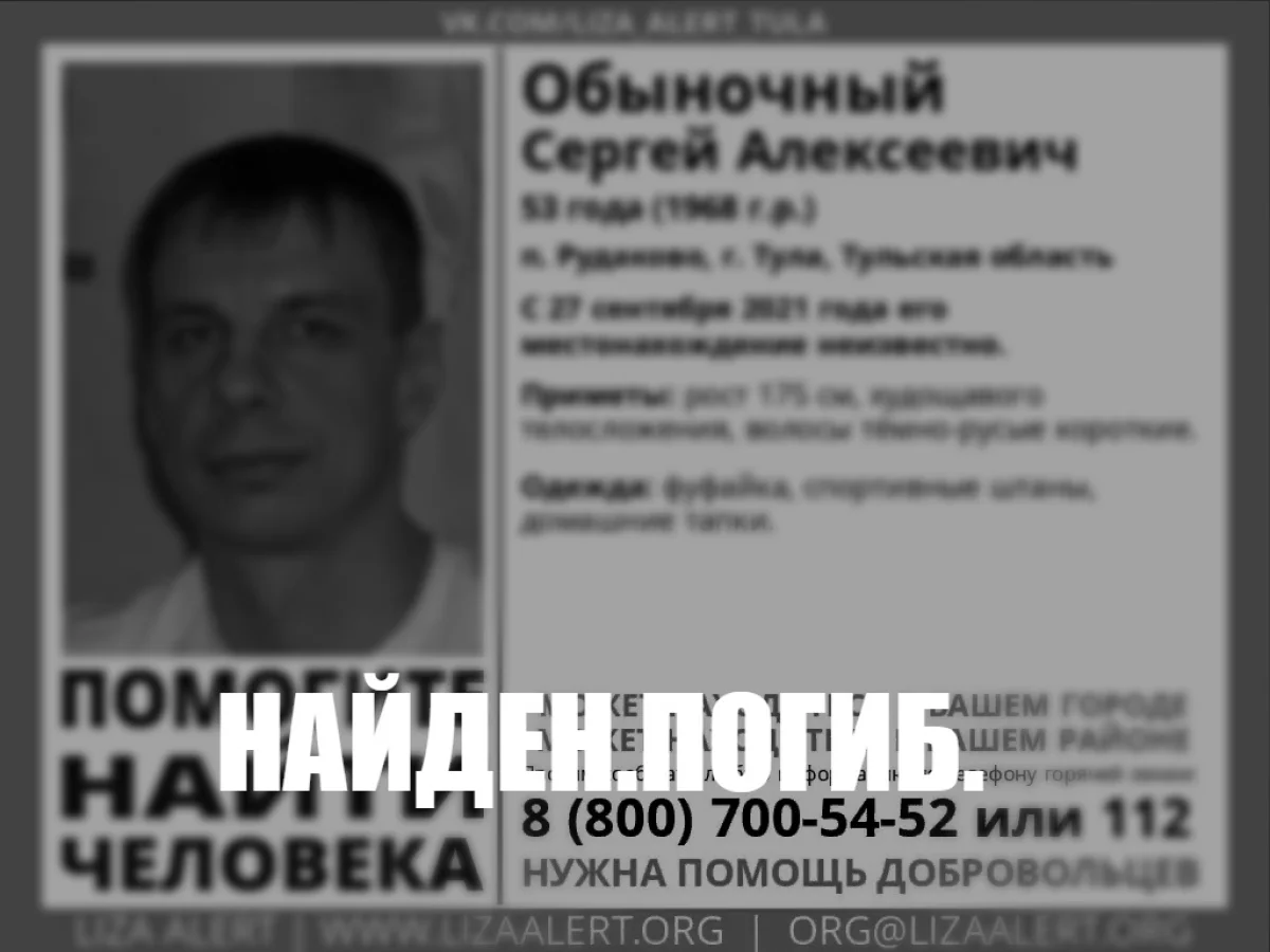 В Тульской области двое местных жителей, пропавших в течение последнего месяца, были найдены погибшими. Это туляк Сергей Алексеевич Обныночный, который с 27 сентября перестал выходить на связь, и Тамара Павловна Арокина (Скрыпникова) из деревни Пашково Узловского района, которая ушла из дома 11 октября.