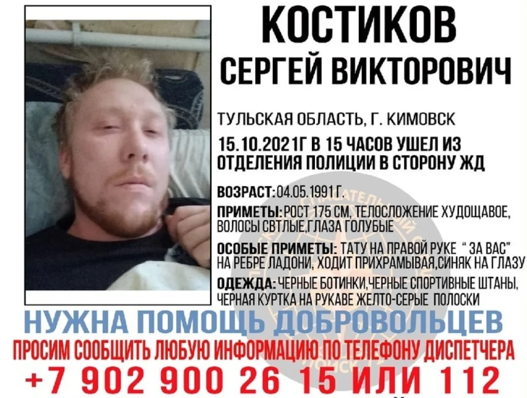 В Кимовске в поиск объявили 30-летнего Сергея Викторовича Костикова. 15 октября 2021 года молодой человек ушел из отделения полиции в сторону железнодорожных путей, с того момента о нем и его местонахождении ничего неизвестно.