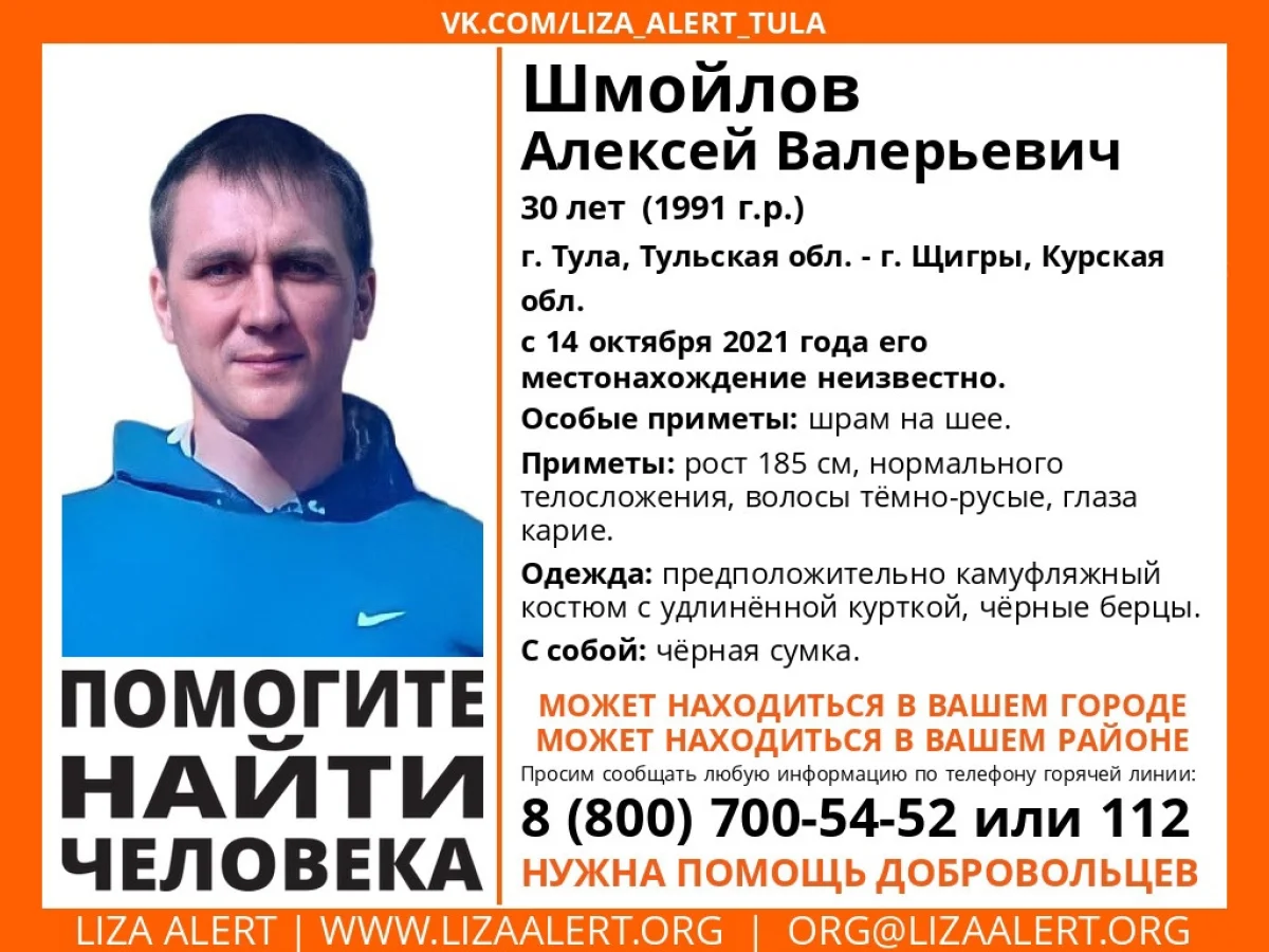 В Тульской области ищут 30-летнего Алексея Валерьевича Шмойлова, пропавшего по дороге в город Щигры Курской области. С 14 октября местонахождение мужчины неизвестно.