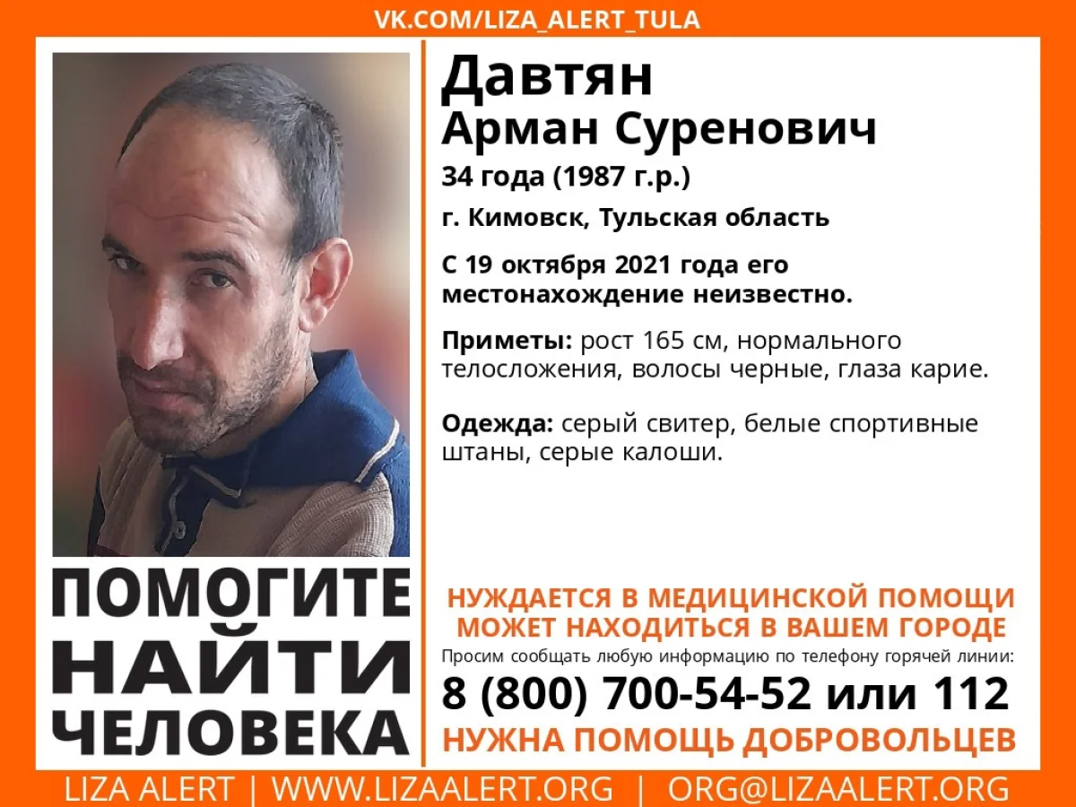 В Тульской области уже десять дней ищут 34-летнего Армана Суреновича Давтяна из Кимовска Тульской области: его местонахождение неизвестно с 19 октября 2021 года.