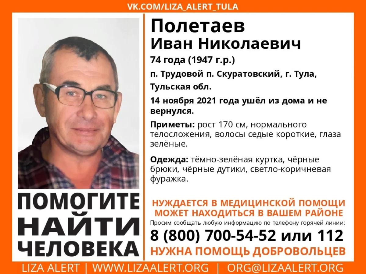В Туле 14 ноября ушел из своего дома в Трудовом поселке и не вернулся 74-летний пенсионер, об этом осообщают поисковики отряда «Лиза Алерт». Пропавший Иван Полетаев ростом 170 см, нормального телосложения, зеленые глаза, седые, короткие волосы. Мужчина нуждается в медицинской помощи.
