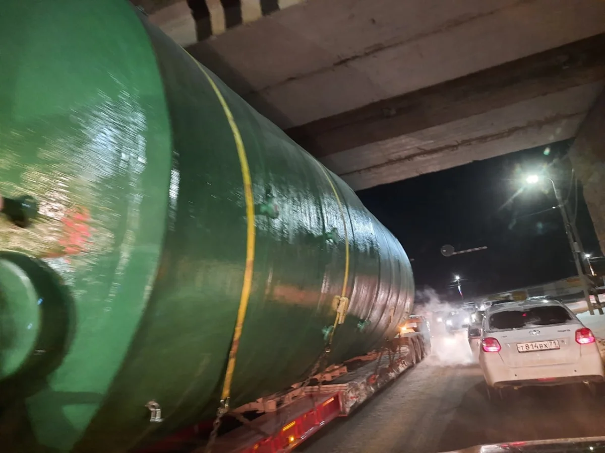в ночь с 21 на 22 декабря в социальных сетях появились видео и фото от очевидцев, сообщивших о тягаче, застрявшем под путепроводом на выезде из Щекино в Тульской области. Высота моста 4,5 метра, но у тягача оказалась негабаритных размеров бочка, которая не прошла под сводом путепровода.