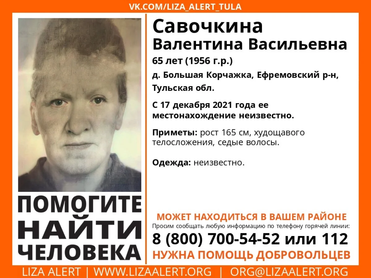 В Ефремовском районе Тульской области волонтеры поисково-спасательного отряда "ЛизаАлерт" приступили к поискам 65-летней Савочкиной Валентины Васильевны. С 17 декабря 2021 года её местонахождение неизвестно.