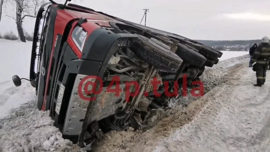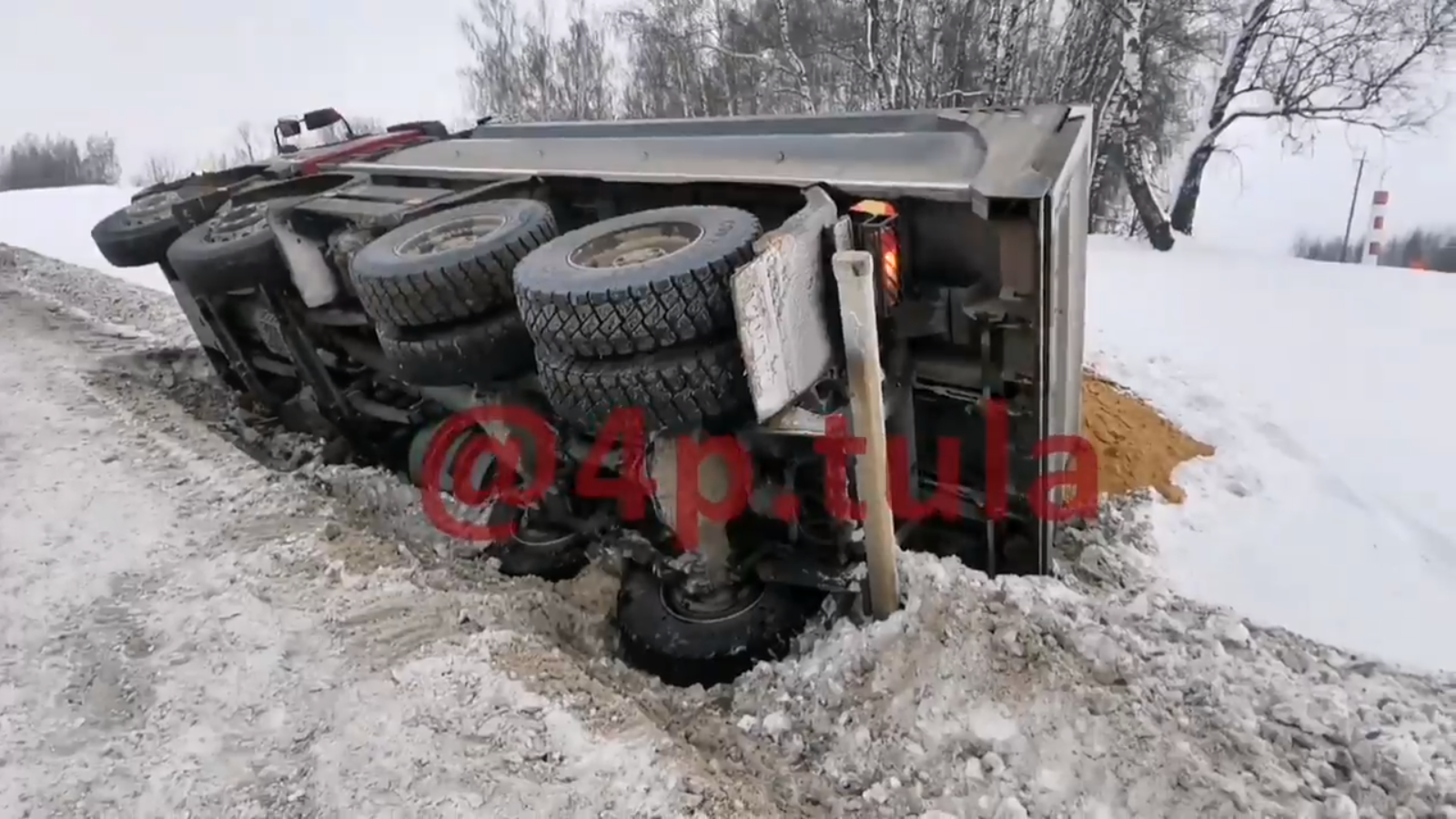 В Тульской области под поселком Иншинский КамАЗ с песком опрокинулся в кювет