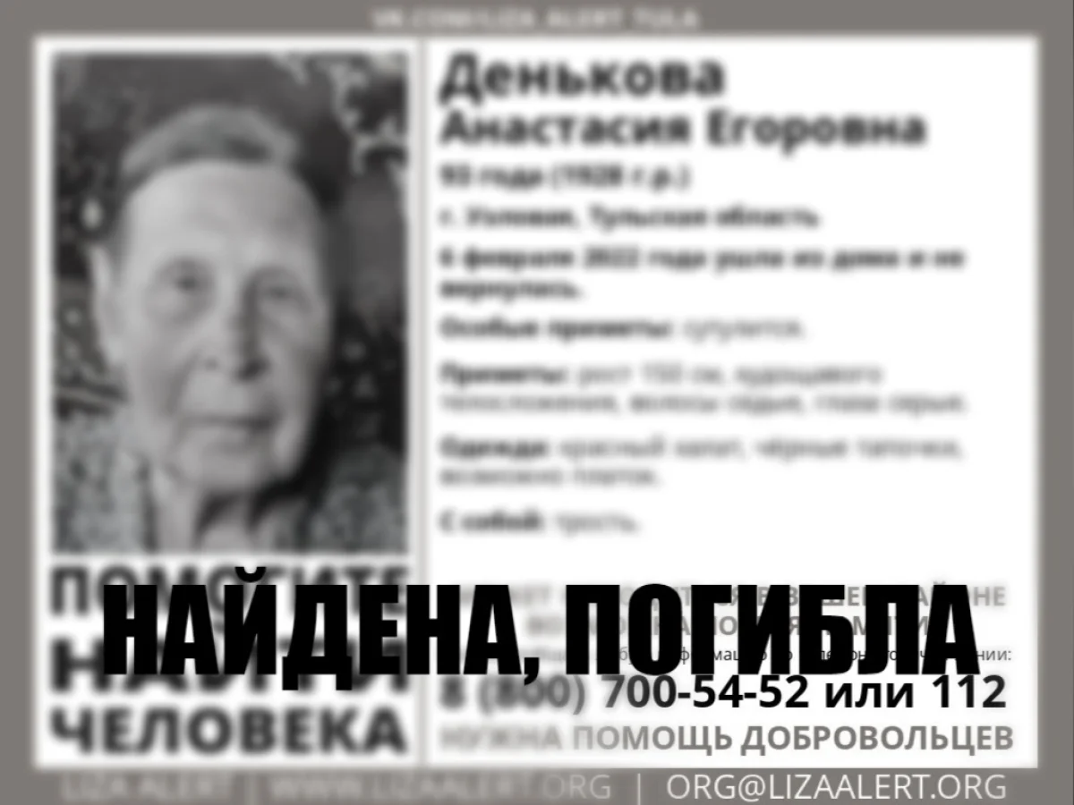 6 февраля в Узловой пропала 93-летняя пожилая женщина, которая ушла из дома в неизвестном направлении и не вернулась, об этом сообщили в группе поисково-спасательного отряда «ЛизаАлерт» по Тульской области. Пенсионерку объявили в розыск.