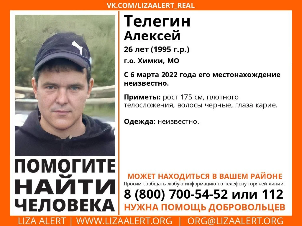Волонтеры поисково-спасательного отряда «ЛизаАлерт» объявили в розыск в Туле пропавшего без вести 26-летнего Алексея Тимофеевича Телегина из Химок, Московская область. Как стало известно, он перестал выходить на связь с близкими 6 марта 2022 года. До сих пор его местонахождение неизвестно.