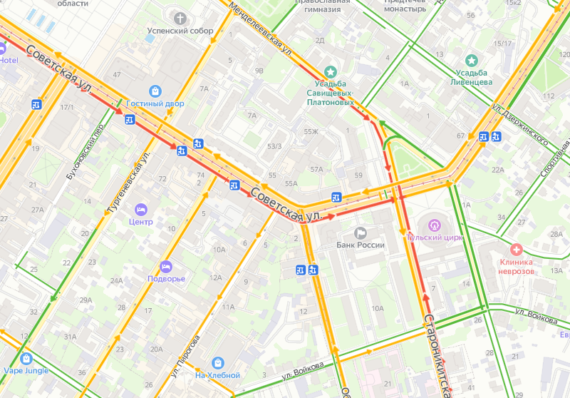 В Туле на пересечении улицы Советской с улицей Оборонной образовался затор: затруднено движение как автомобилей, так и трамваев. По сообщениям очевидцев, на этом участке на стрелке с рельсов сошел трамвай, и движение этого вида транспорта в сторону Криволучья и Щегловской Засеки перекрыто.