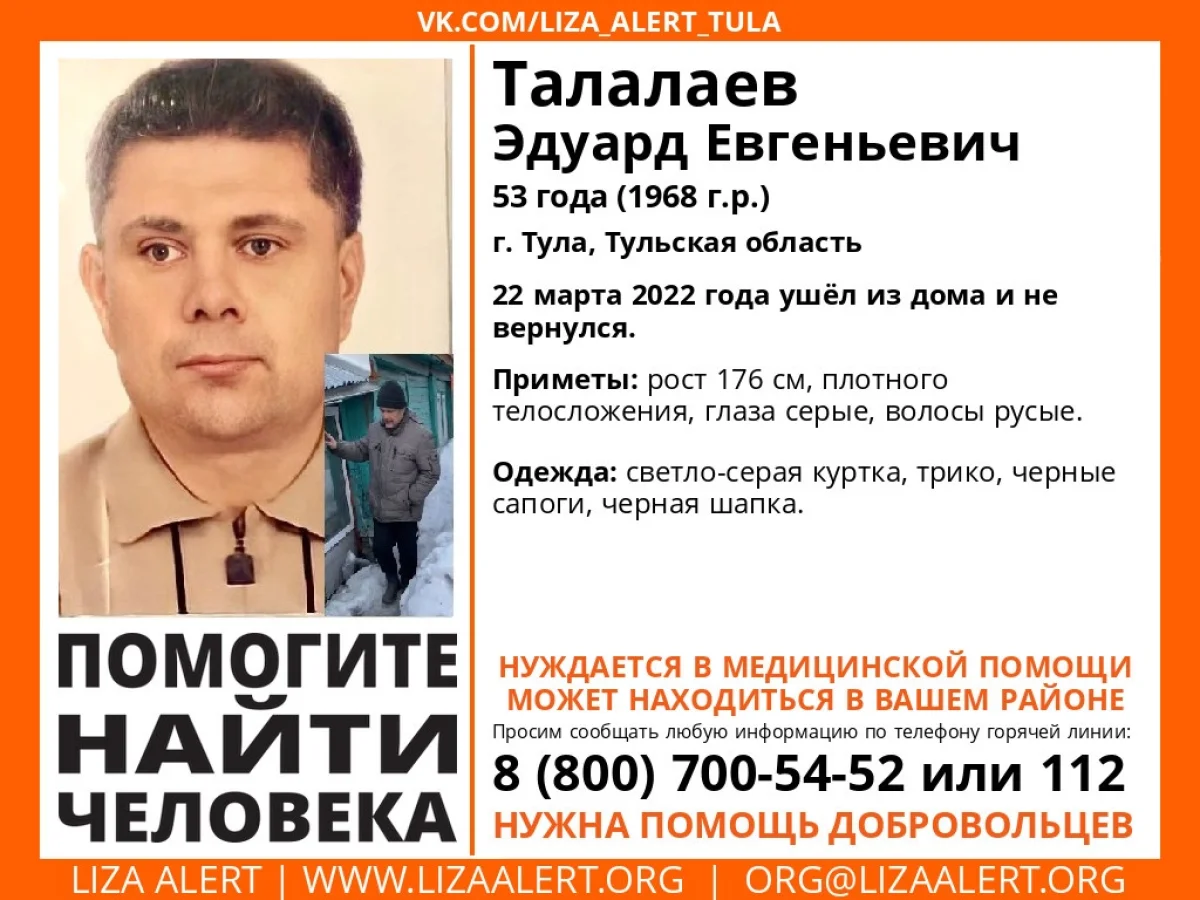 В Туле второй раз за неделю пропал один и тот же мужчина, 53-летний Эдуард Евгеньевич Талалаев. Первый раз он ушел из дома 19 марта и был найден живым на следующий день. А сегодня, 23 марта, он снова был объявлен в розыск поисковиками "ЛизаАлерт" как пропавший без вести.