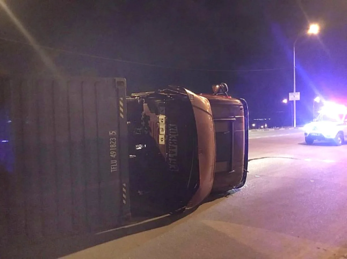 12 июля в 23:00 в Алексине на площади Свободы перевернулся большегруз Scania. По предварительным данным, произошло это в ходе движения по кольцу из-за неправильно распределенного в кузове груза.