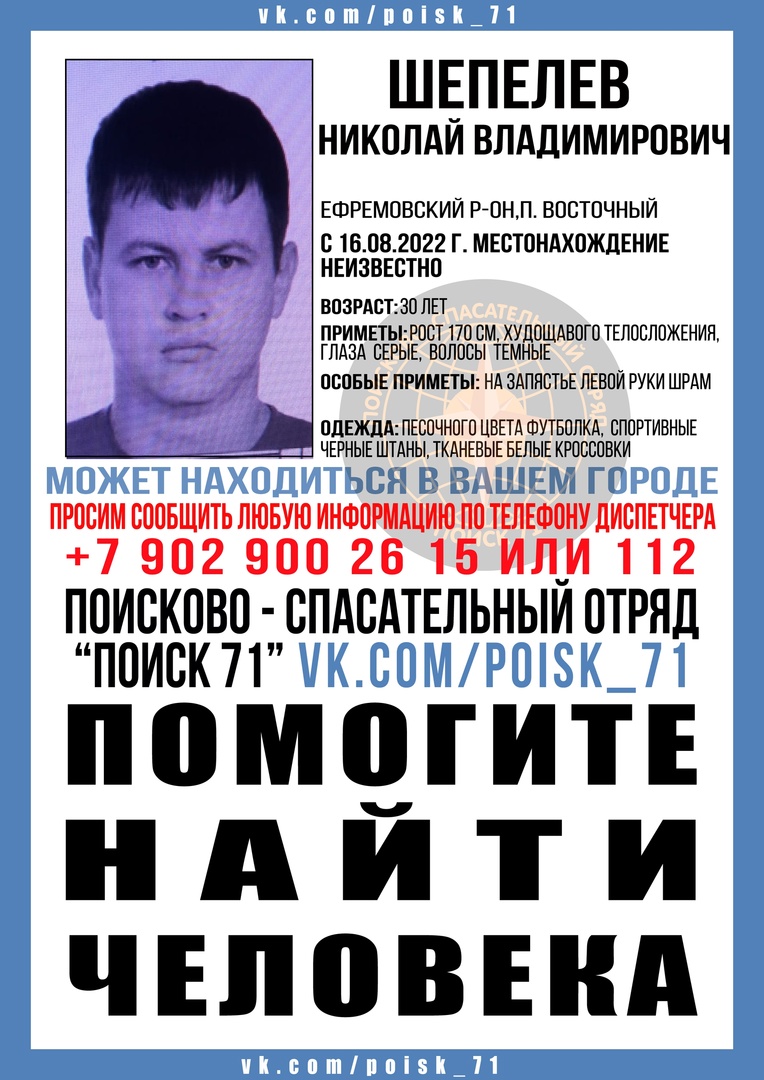 Житель поселка Восточный под Ефремовом Шепелев Николай Владимирович вышел из дома 16 августа и не вернулся.
