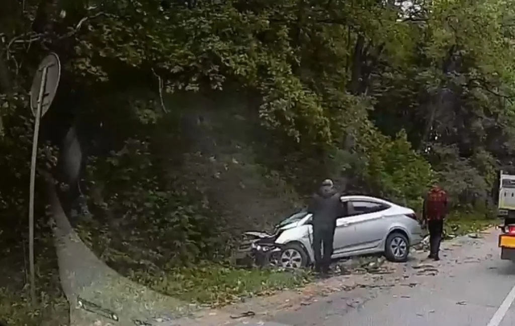 На видео заметно, что сильно поврежденный автомобиль съехал на обочину около дорожного знака. Рядом лежит крупный обломок дерева, разбросаны щепки.
