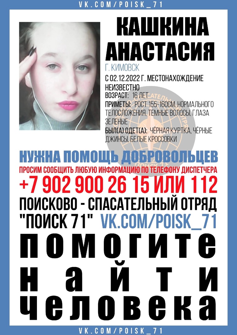 Если вы видели эту девушку, свяжитесь с диспетчером отряда "Поиск 71": 8(902) 900-26-15 или позвоните в Единую службу спасения 112.