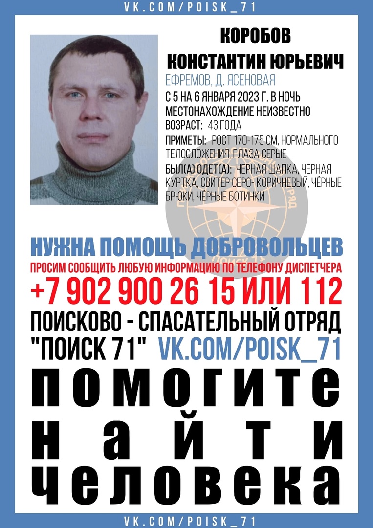 Коробов КОнстантин Юрьевич проживает в деревне Ясеновая. Последний раз его видели в ночь с 5 на 6 января. С тех пор он домой не возвращался.