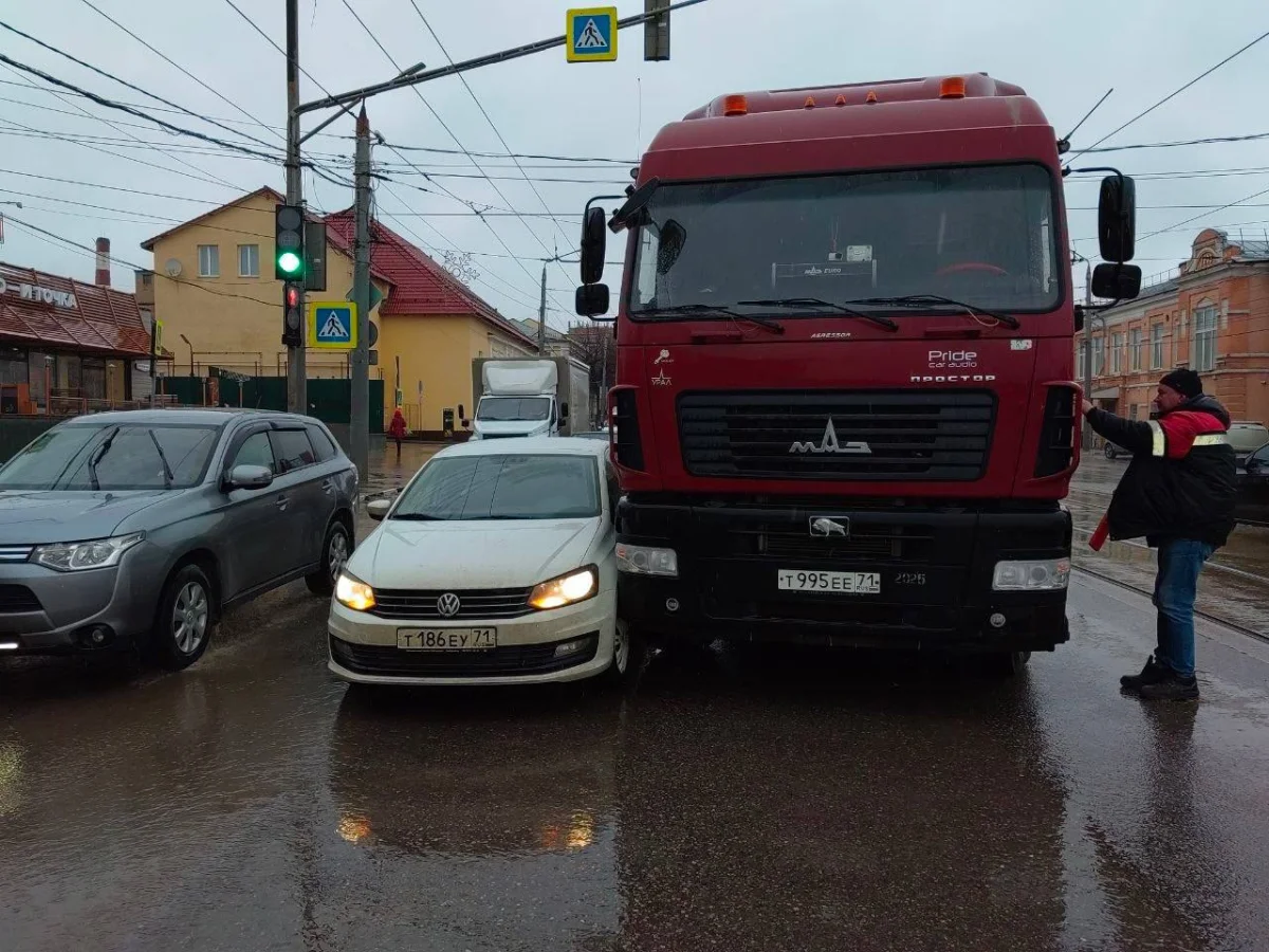 Утром 16 марта в Туле на улице Октябрьской столкнулись Volkswagen и эвакуатор МАЗ. ДТП произошло на перекрестке с улицей Арсенальной около ресторана быстрого питания "Вкусно и точка".