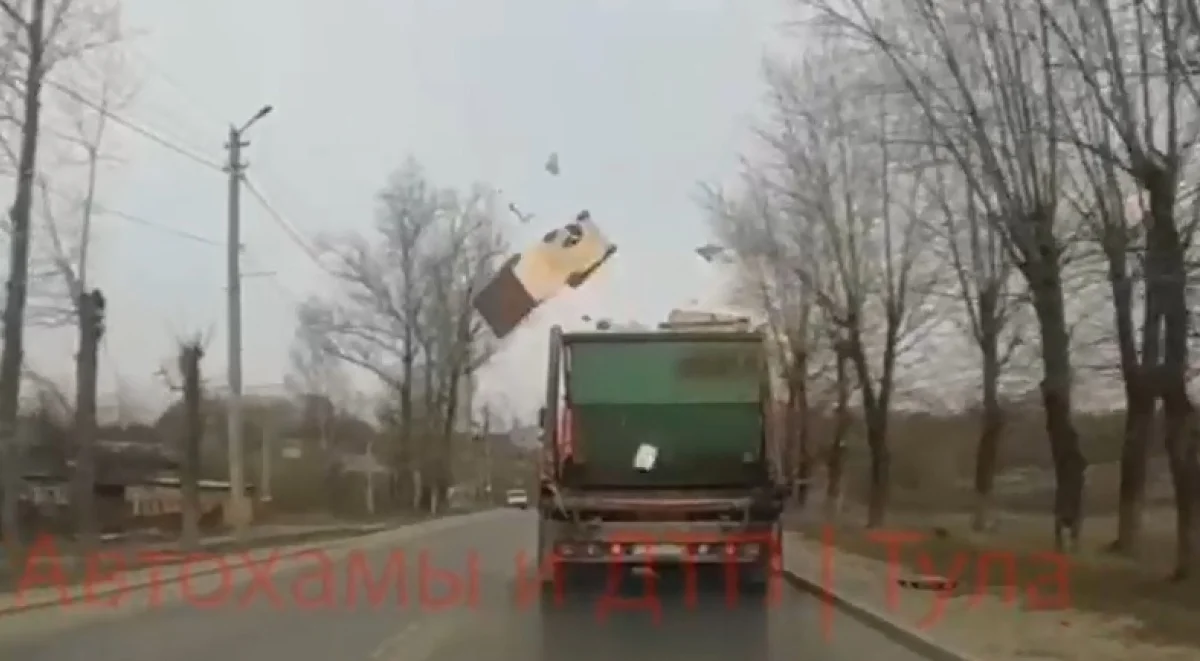 В Узловой произошло забавное ДТП: на ходу с мусоровоза выпал шкаф. Это попало в поле камеры регистратора, видео с которой опубликовали в социальных сетях.